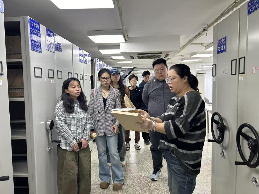 在档案查阅大厅,姜娜老师以实物展示与讲解相结合的方式,向同学们介绍了档案的定义、种类,介绍了从档案材料的收集、整理、分类、鉴定、组卷到入库的完整流程。随后,学生们分组走进档案库房和数字化加工间,近距离观察档案排架、电子扫描等工序。不少同学第一次看到合校前的纸质档案、老地图等原件档案,纷纷发出惊叹。